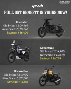 1. Jawa Yezdi Motorcycles – biggest winners: With GST reduced to 18 percent for motorcycles under 350cc, the aspirationaland truly heritageJawa and Yezdi motorcycles are now more achievable than ever, Classic Legends proudly passing on 100% of the reduced tax benefit to consumers.