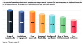 • Credit-led payment methods tend to have a dual impact on consumer behavior for Gen Z & Millennials. While for many, the ease, availability, instant rewards or deals and social influence spark spontaneous splurges (65%), a savvy segment (25%) uses these tools find the best bargains and to track spending.