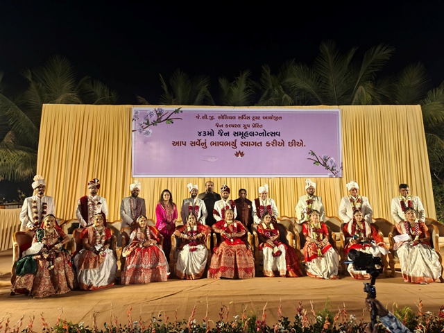 AHMEDABAD | 08th FEBRUARY 2026 — The JCG Social Service Trust organised the 43rd Jain mass marriage ceremony, during which nine couples solemnised their marriages in accordance with Jain traditions. The ceremony was held on Sunday at the Seven Seas Party Plot near Science City Circle.