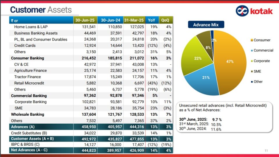 Consolidated Customer Assets which comprises Advances (incl. IBPC & BRDS) and Credit Substitutes grew to ₹ 557,369 crore as at June 30, 2025, up 13% YoY from ₹ 494,105 crore as at June 30, 2024.